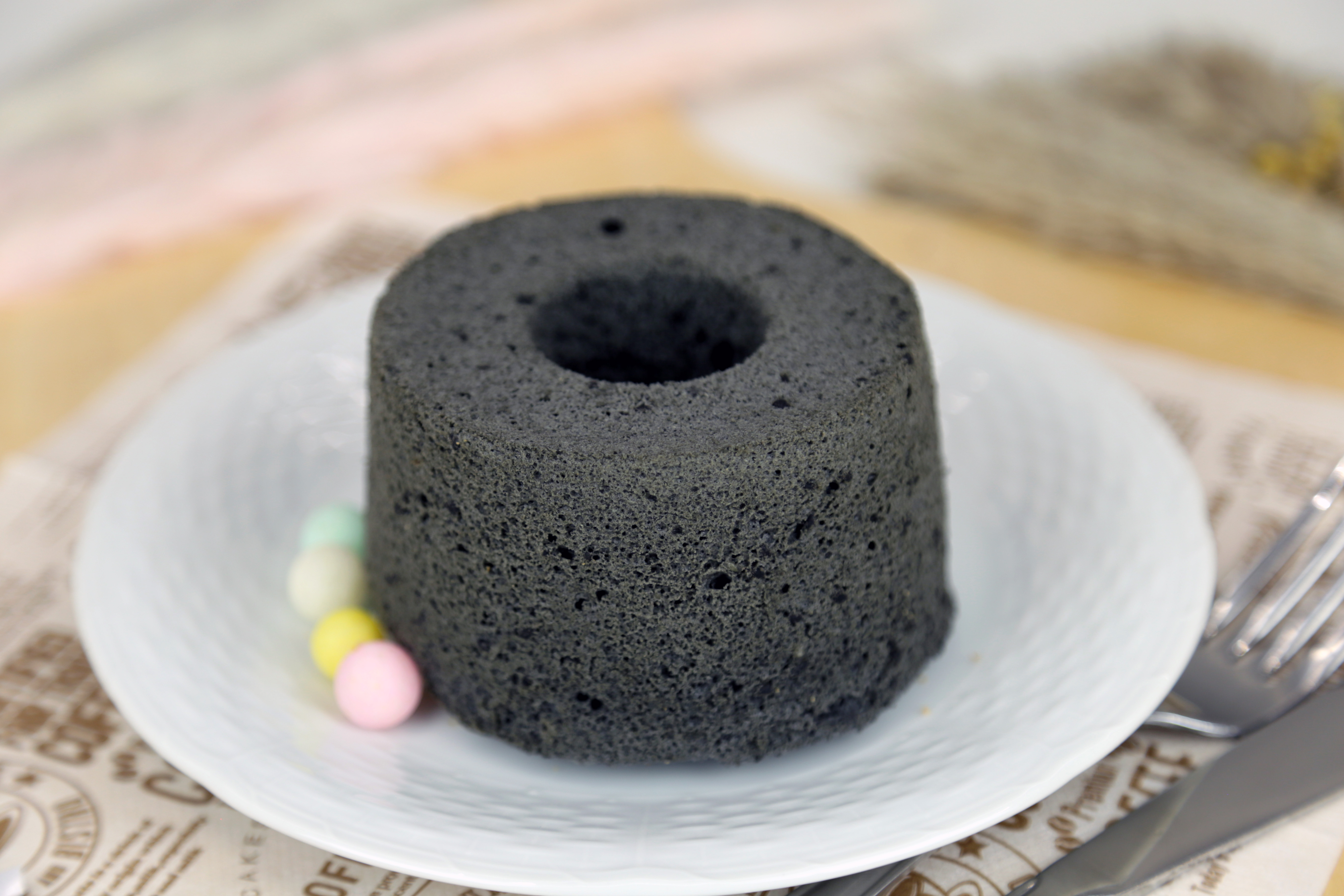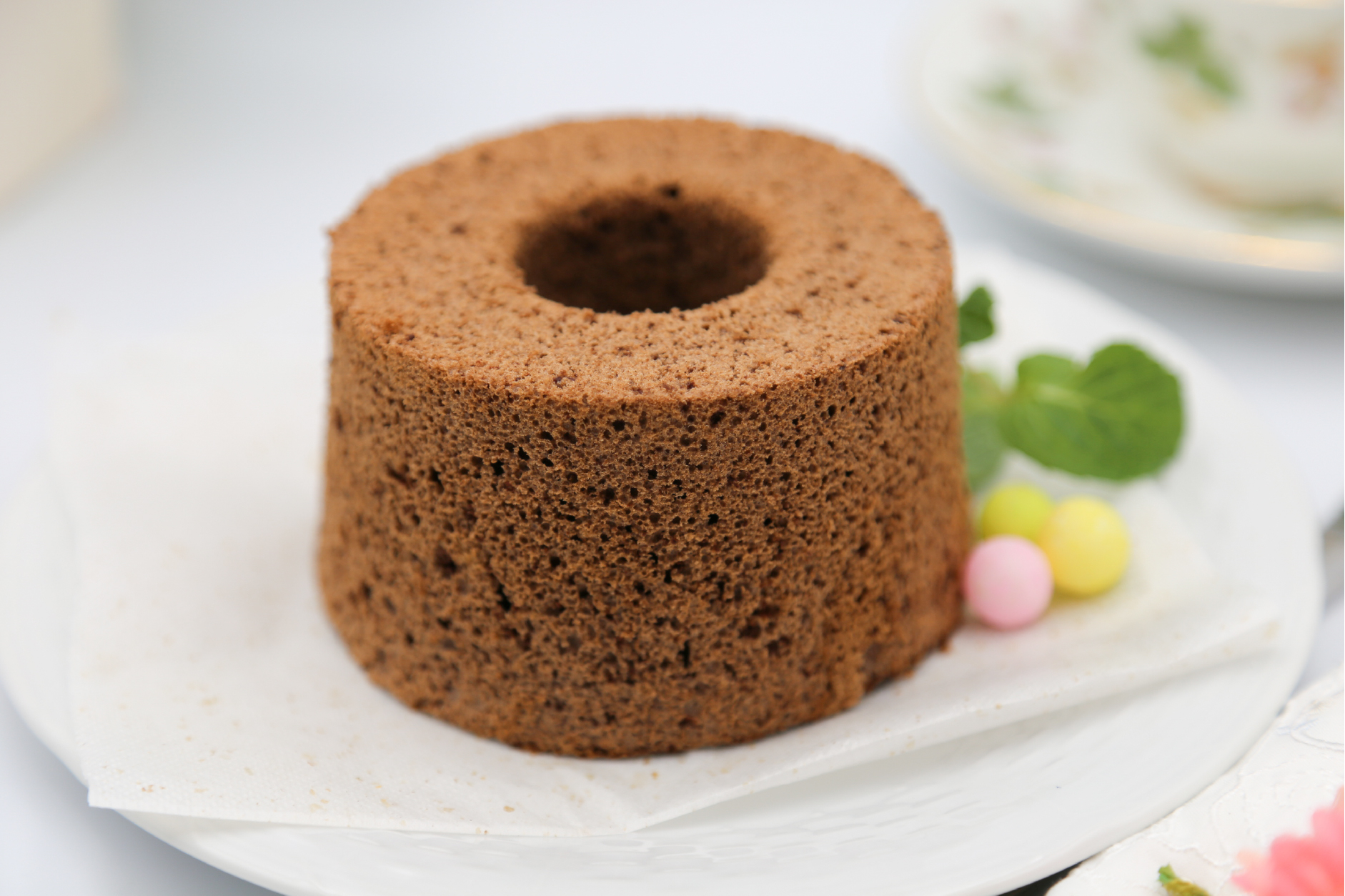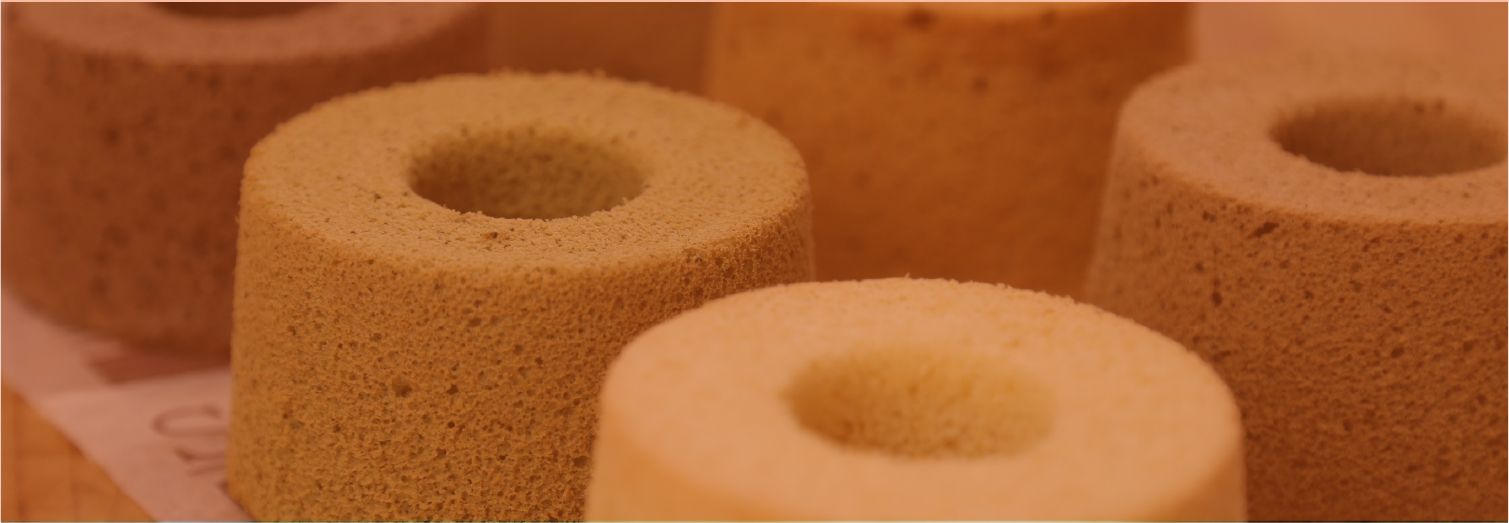 カカオ風味を感じてもらうためにカカオ100%のパウダーと焼いても粒が残る微粒子のチョコレートで焼いたシフォンケーキです。