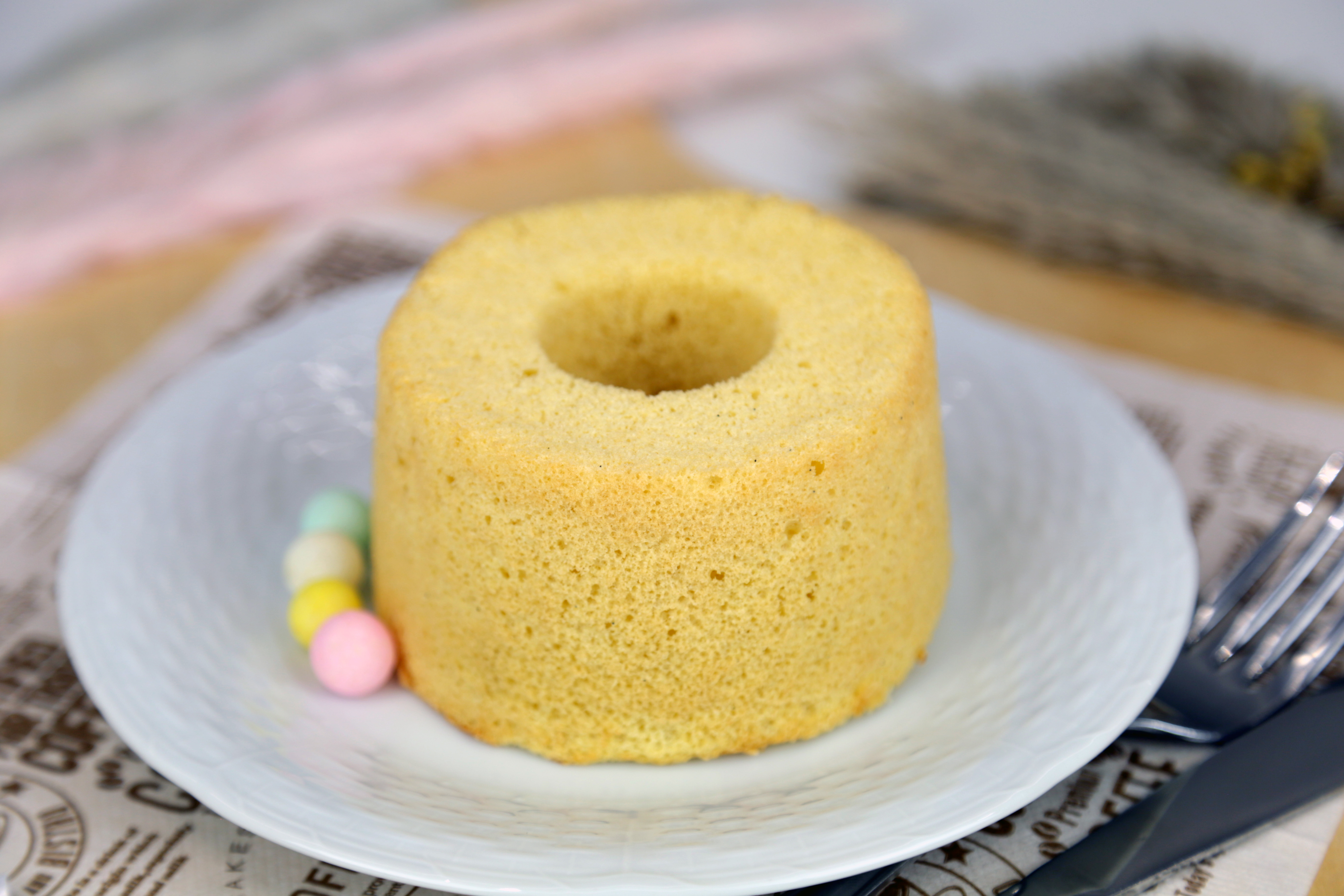 有機栽培のバニラビーンズを使ったほんのり甘い薫りのシフォンケーキです。黒い粒はバニラの種です。