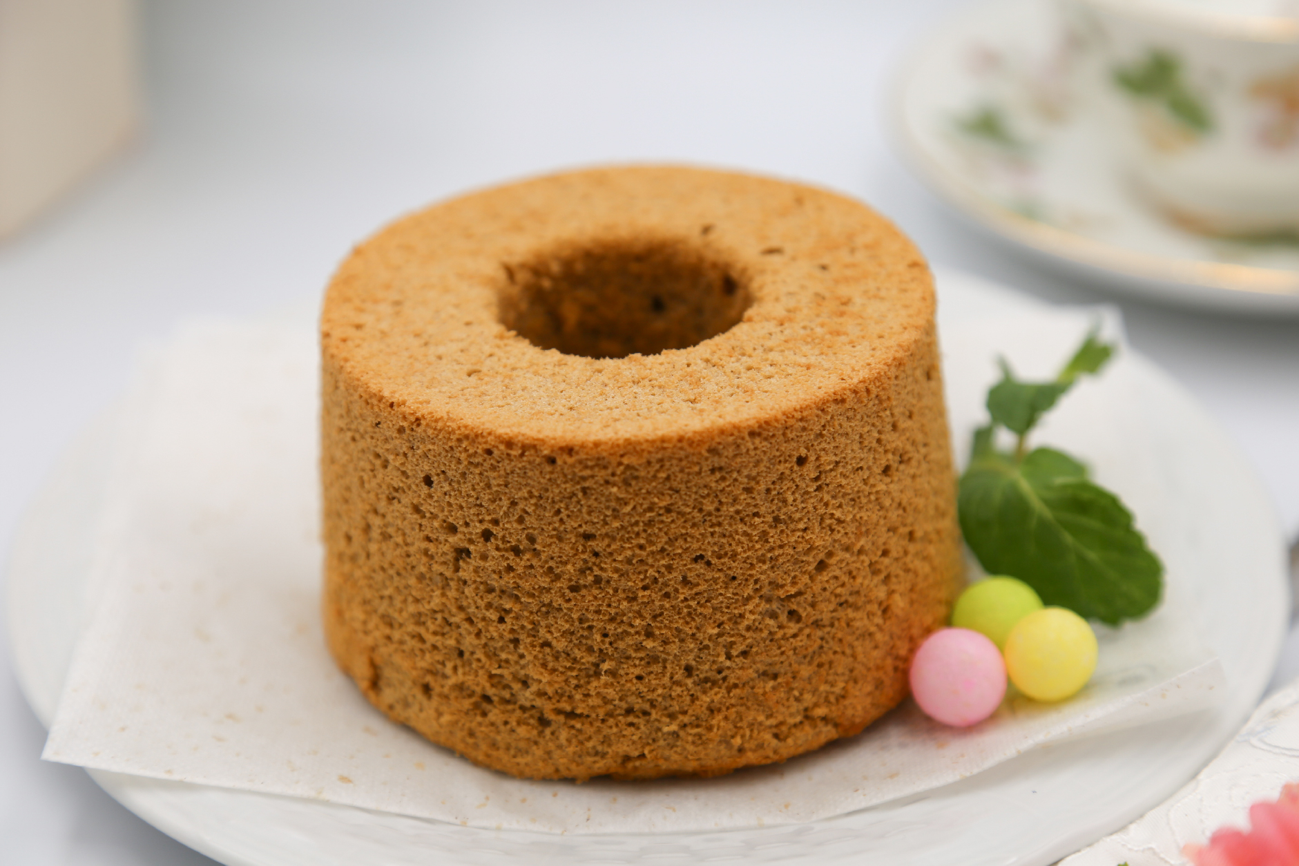 最高等級茶葉”銀豪(ぎんごう)”を使用したジャスミンシフォンケーキです。茶葉を細かく刻むことで、ジャスミンの華やかな薫りに相性抜群のドライマンゴーのカットをアクセントとしていれています。