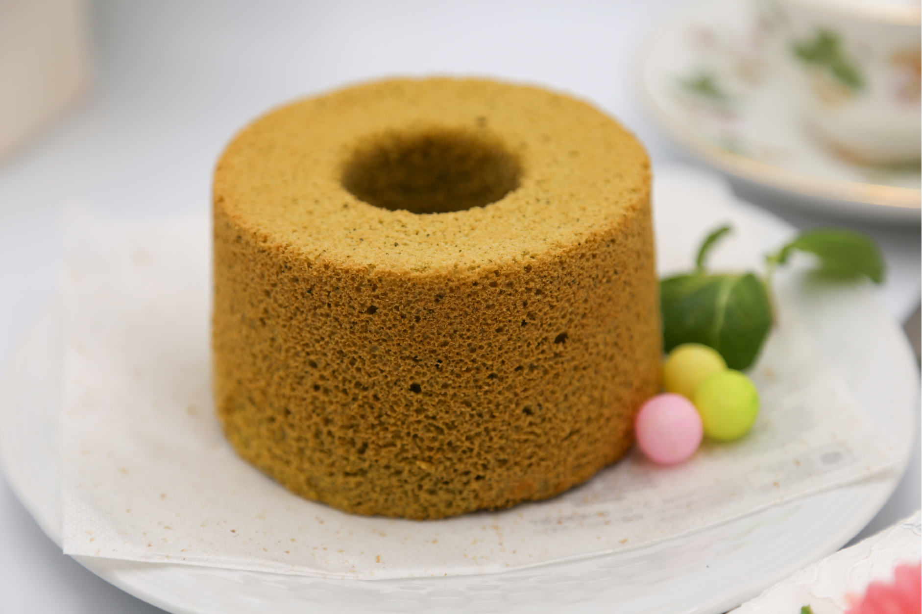 抹茶を使った目にも鮮やかなシフォンケーキです。抹茶の独特の甘さ、風味もしっかり感じていただけます。ただし光に弱いため不織布で包んでいます。